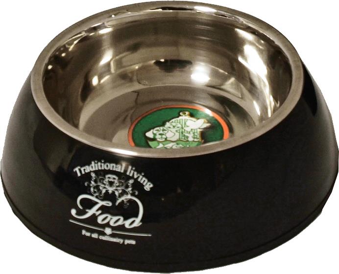 Črna pasja posoda za hrano ali vodo z napisom.