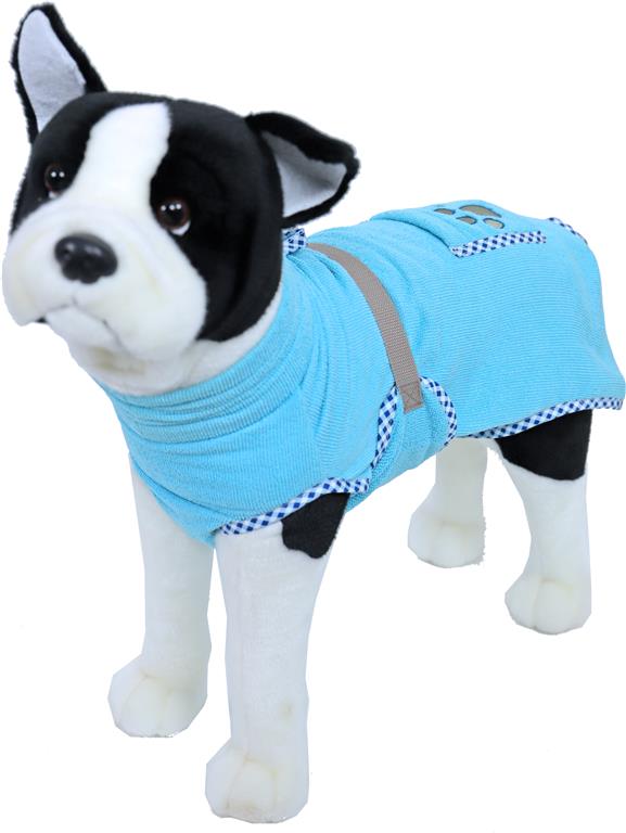 Po kopanju se psi vedno otresejo in ob tem lahko zmočijo okolico. Tkanina kopalnega plašča vpije vlago in prepreči, da bi vaš pes zmočil celotni hiši. Poleg tega je kopalni plašč zelo primeren tudi, če ste bili na primer na plaži in želite preprečiti, da bi se avto močno zmočil. Kopalni plašč ima v vratnem delu elastiko, ki jo je mogoče zategniti, ožji del pri repu za boljšo povezavo okoli zadnjice in pri prsnem košu, kar preprečuje, da bi veliko vode uhajalo skozi.