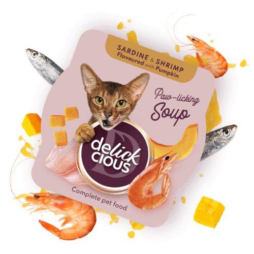 Hranljiva mešanica mamljive sardine in mesnatih kozic s pridihom buče. Ta mačji užitek v obliki juhe predstavlja popoln obrok z uravnoteženo sestavo esencialnih hranil, ki zadovoljijo potrebe vaše mačke.
