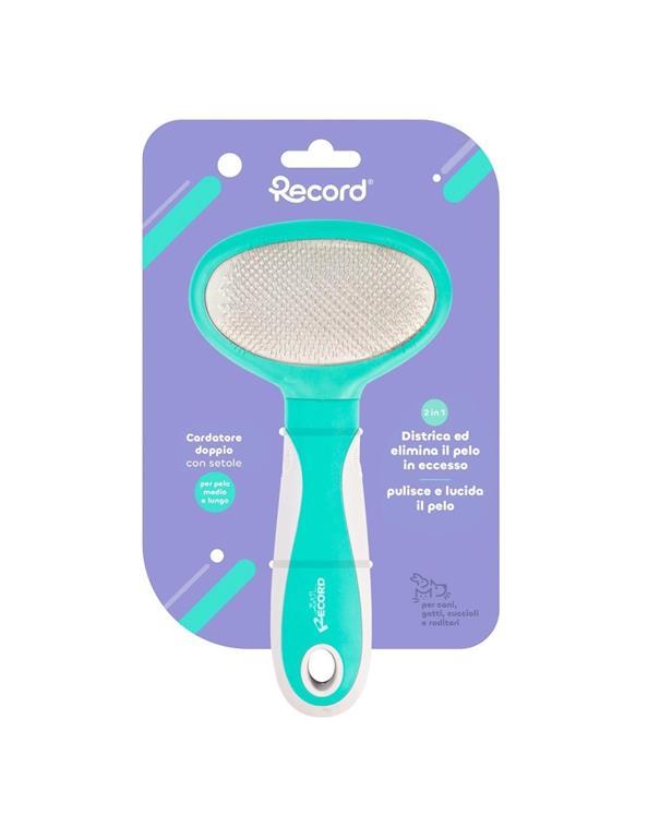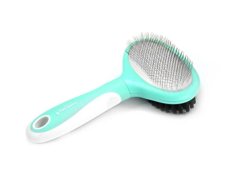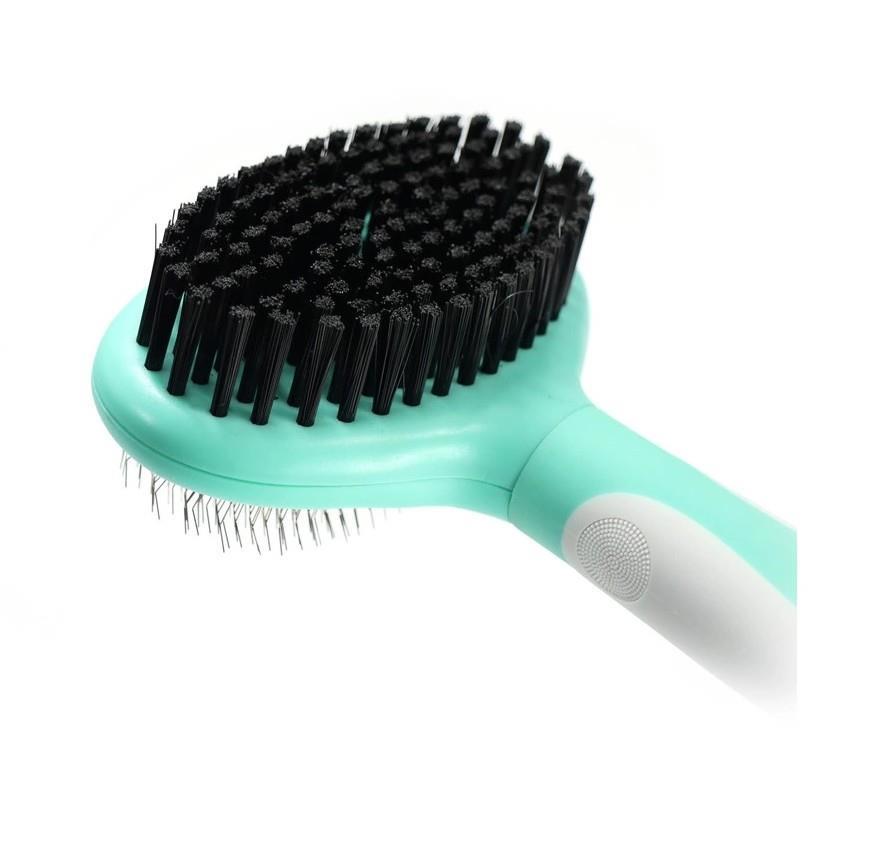 Dvojna krtača z nedrsečim, ergonomskim ročajem: stran z jeklenimi konicami razčeše vozle in temeljito očisti dlako, saj odstrani umazanijo in odmrle dlake, medtem ko stran s ščetinami poskrbi za glajenje in sijaj ter odstrani površinsko umazanijo (prah, delce ipd.).