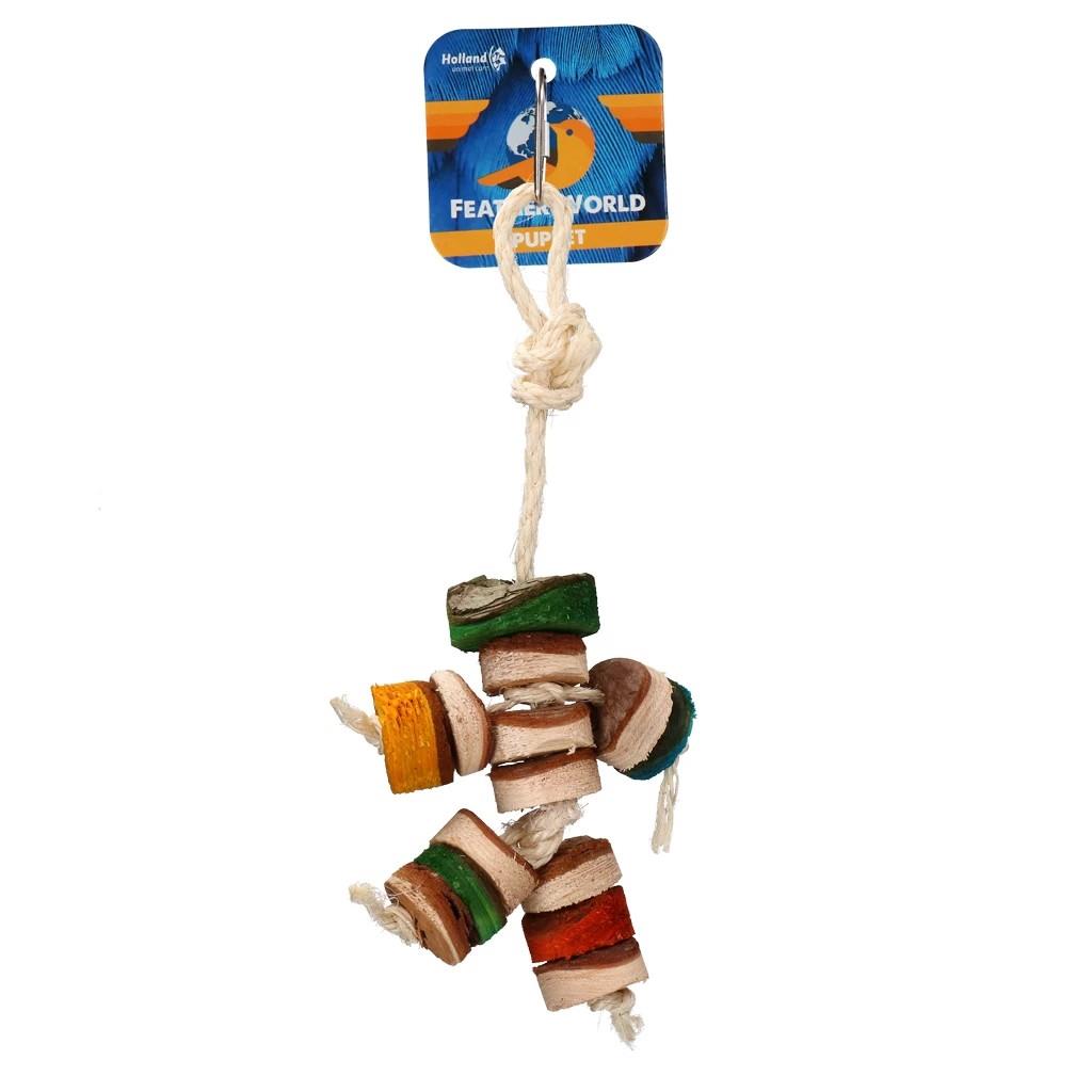 Ta igrača za ptice je izdelana iz vrvi in lesenih blokov.
