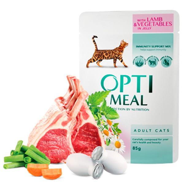 Optimeal, mokra hrana za odrasle mačke, je narejena iz okusnih koščkov jagnjetine in zdrave zelenjave obdane v slasten žele, ki ga mačke naravnost obožujejo. Dodane ima vse dobrote (kot so lososovo olje, kamilični cvetovi, ognjič, timijan, brusnice, ...), značilnih za Optimeal hrano. Podpora imunskega sistema in prebavnega trakta, je njena posebnost, saj sta recepturi dodana MacroGard?® in Actigen TM, ki s pomočjo prebiotikov in antioksidantov varujeta zdravje vaše mačke.