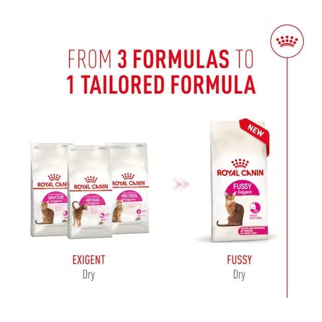 Hkrati podpira zdravje sečil in je primerna tudi za sterilizirane mačke. Da bi izboljšali okusnost in doživetje ob obroku, formula Fussy združuje tri naše nekdanje diete Exigent – Savour, Aroma in Protein – v enem okusnem izdelku: ROYAL CANIN® Fussy.