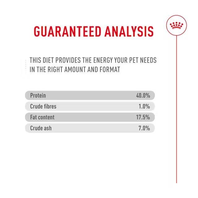 Analitske sestavine Beljakovine: 40,0 % – Surova vlaknina: 1,0 % – Maščoba: 17,5 % – Surovi pepel: 7,0 % – Presnovna energija: 4175 kcal/kg. Izjava L.I.P. L.I.P.: beljakovine, izbrane zaradi svoje zelo visoke prebavljivosti.