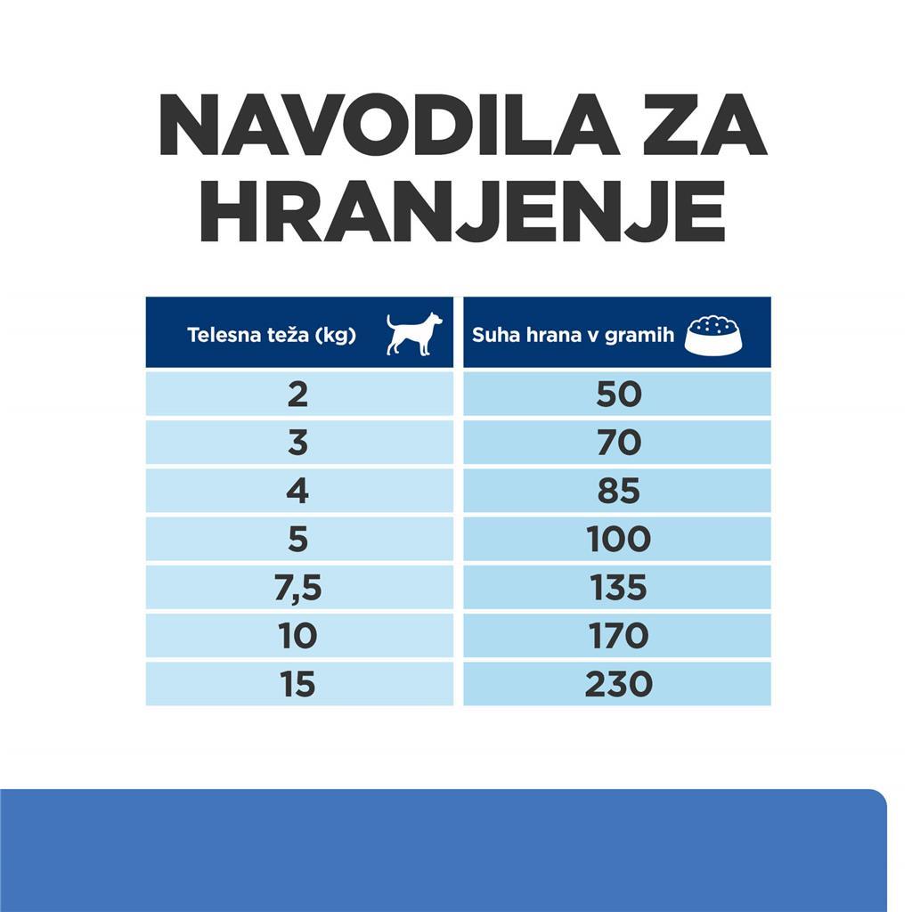 Hranite izključno to hrano. Pred uporabo ali pred podaljšanjem obdobja uporabe se je priporočljivo posvetovati z veterinarjem. Hranite priporočeno dnevno količino navedeni na embalaži, glede na velikost psa. Prilagodite količino hrane za ohranitev optimalne teže. Dnevno količino lahko razdelite na dva ali več obrokov.