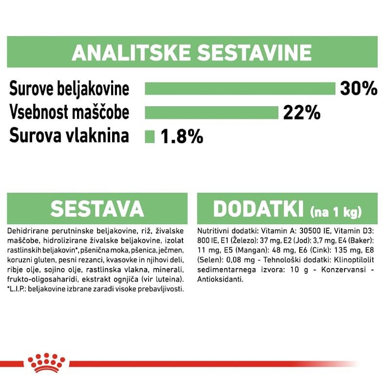 Za Royal Canin so beljakovine zelo pomembne. Uporabljamo samo najkakovostnejše beljakovine prilagojene vrste, ki ustreza posebnim potrebam vašega psa. Prav zato hrana ROYAL CANIN® Digestive Care Mini vsebuje visokoprebavljive beljakovine, znane pod kratico L.I.P.