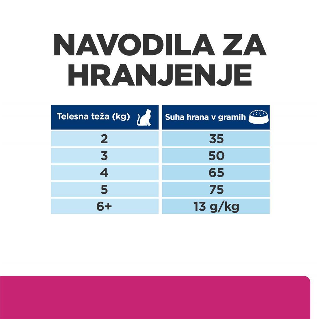 Navodila za hranjenje: Hranite izključno to hrano. Pred uporabo se je priporočljivo posvetovati z veterinarjem. Hranite priporočeno dnevno količino navedeni na embalaži, glede na velikost mačke. Prilagodite količino hrane za ohranitev optimalne teže. Dnevno količino lahko razdelite na dva ali več obrokov.